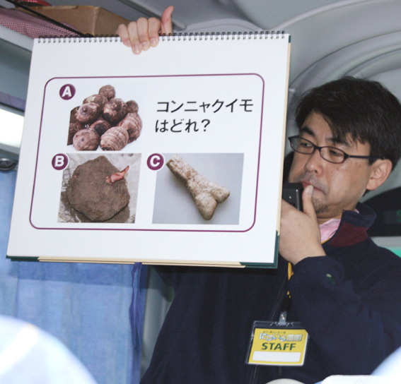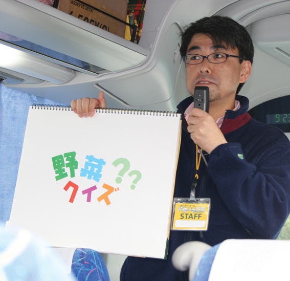 関越自動車道に入り、昭和ICまでのバス車内では野菜に関するクイズ大会が催されました。問題の内容も老若男女・有識者問わず、ツアー参加者全員が楽しめるような問題構成でした。