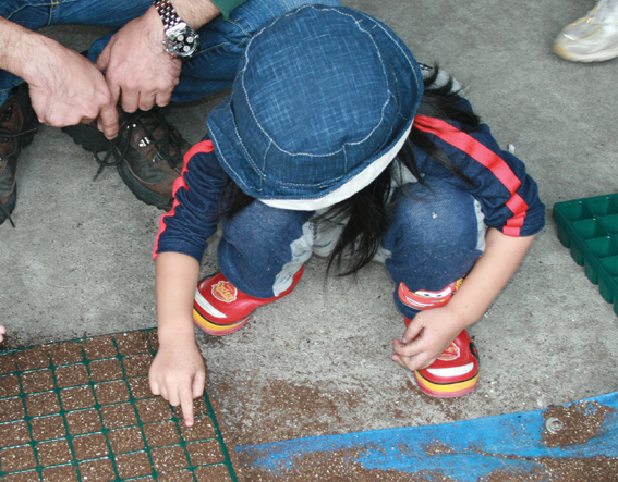 第1農園に場所を移動して、今度は農地を実際に耕し、「畝立て」、「マルチシート張り」「苗の植付」をツアー参加者にも体験してもらいました。マルチシート張りの後は、苗の移植を皆さんで、体験してもらいました。お子様も真剣に苗の移植に取り組んでいました。