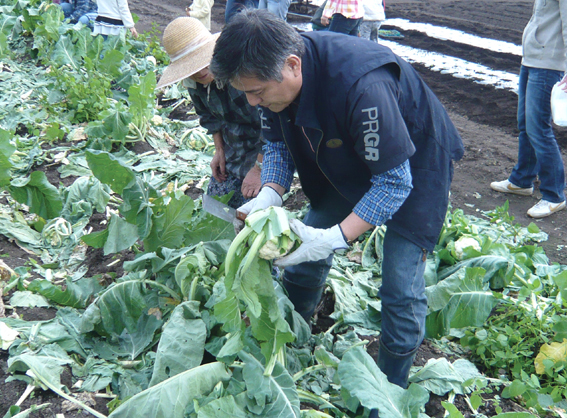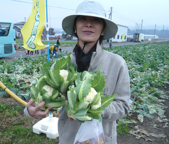 この日のために、あらかじめ栽培しておいたカリフラワーの収穫をツアー参加者に体験していただきました。収穫した野菜も、先日の台風の影響を受けており、農業を通じて自然の厳しさも感じ取ったことでしょう。